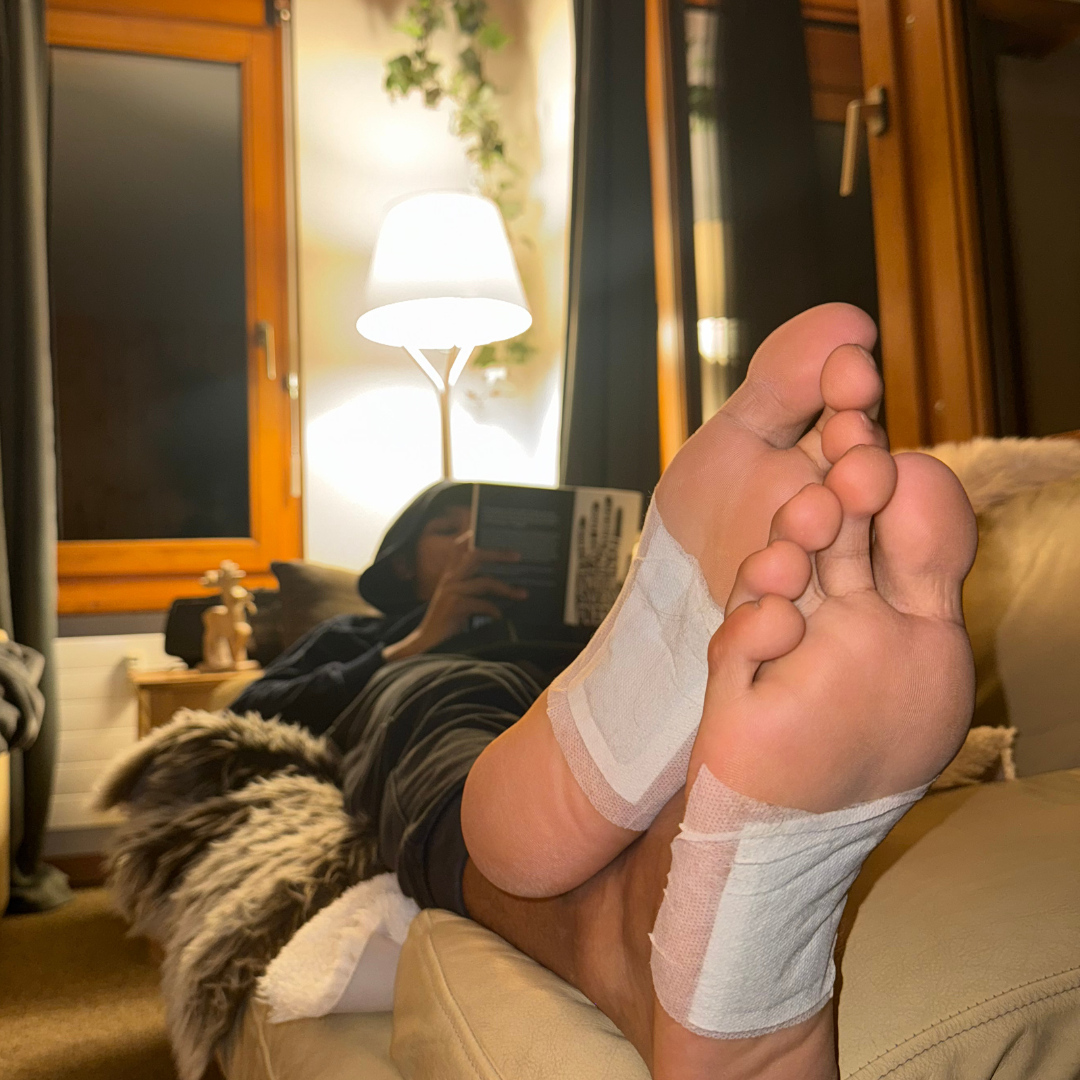 Platziere das Footpad mittig auf der Fussohle, fixiere es sorgfältig und lass es 6–8 Stunden wirken, idealerweise über Nacht.
